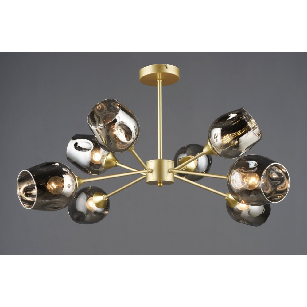 Елегантна люстра на 8 плафонів — розкішна прикраса вашого інтер’єру. Стриманий, але ефектний золотий колір, прозорі скляні плафони та витончена форма надають їй шарму та візуальної легкості. Чудово підходить для великих кімнат, холів, ресторанів або готелів.