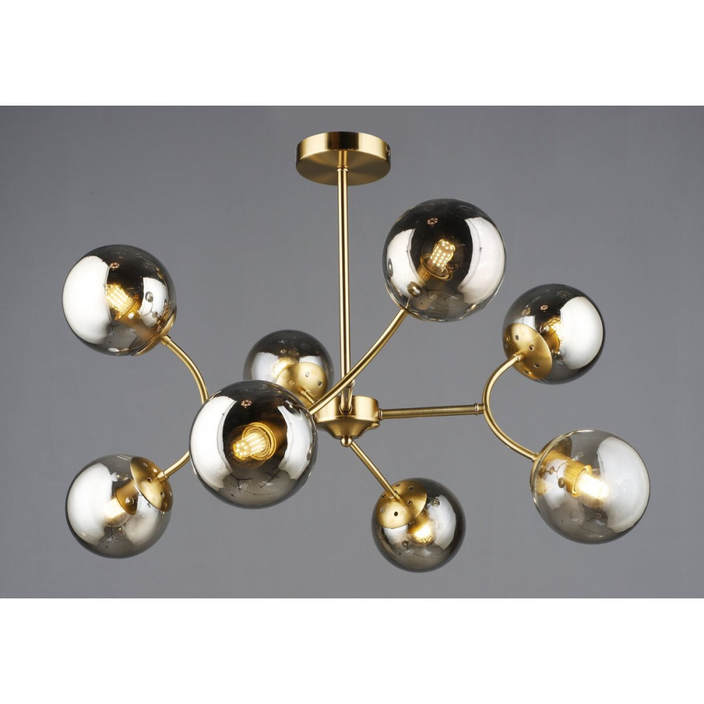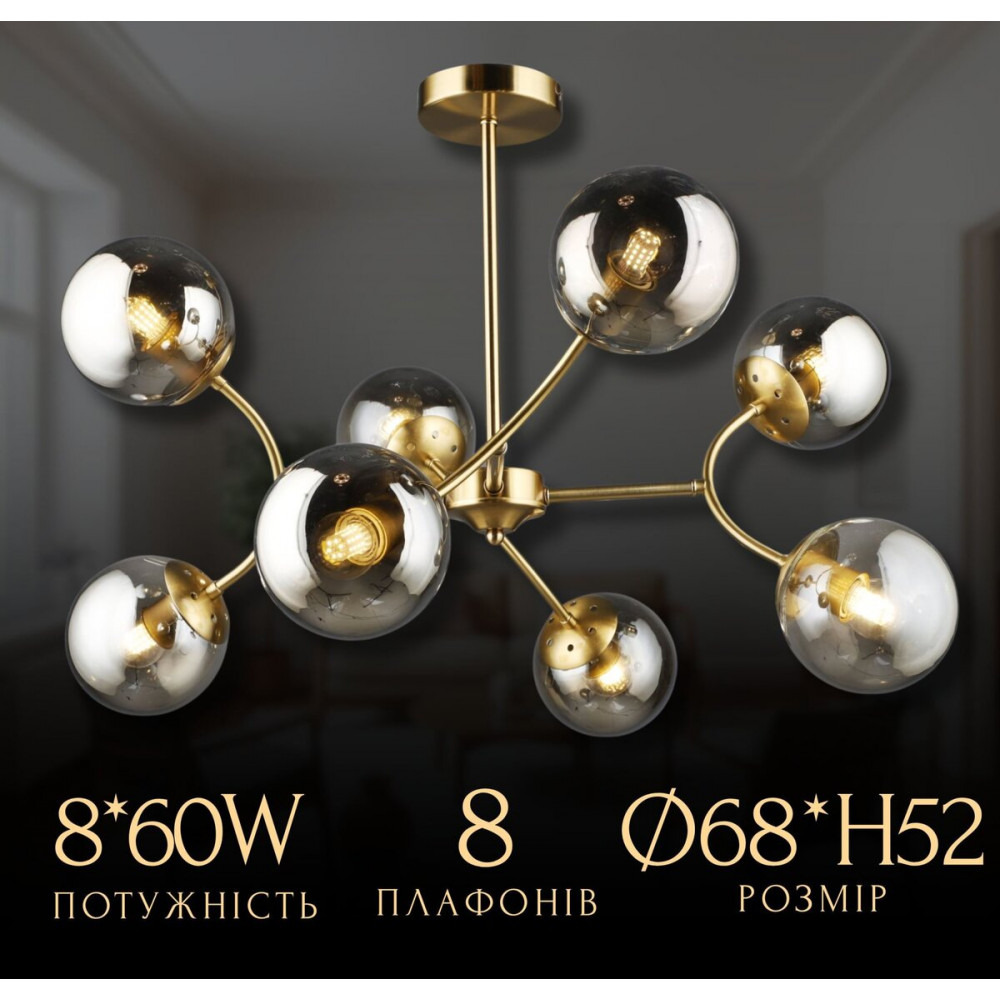 Вишуканий та потужний стельовий світильник, який поєднує в собі класику і сучасний стиль. Елегантна форма, насичений мідний колір, поєднання скла зі сталлю — усе це створює неповторний акцент у вашому інтер’єрі. Завдяки 8 патронам E27, світильник забезпечує потужне освітлення та підходить як для затишної вітальні, так і для просторої кімнати.