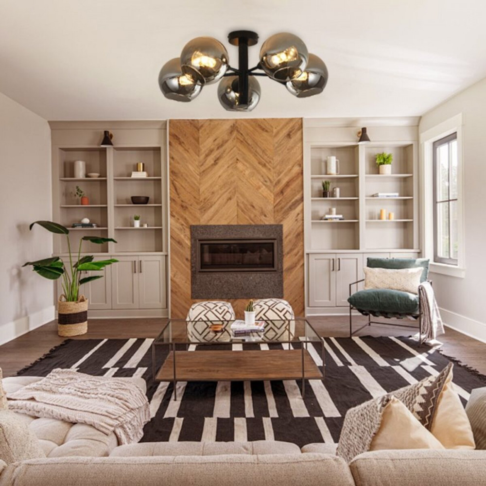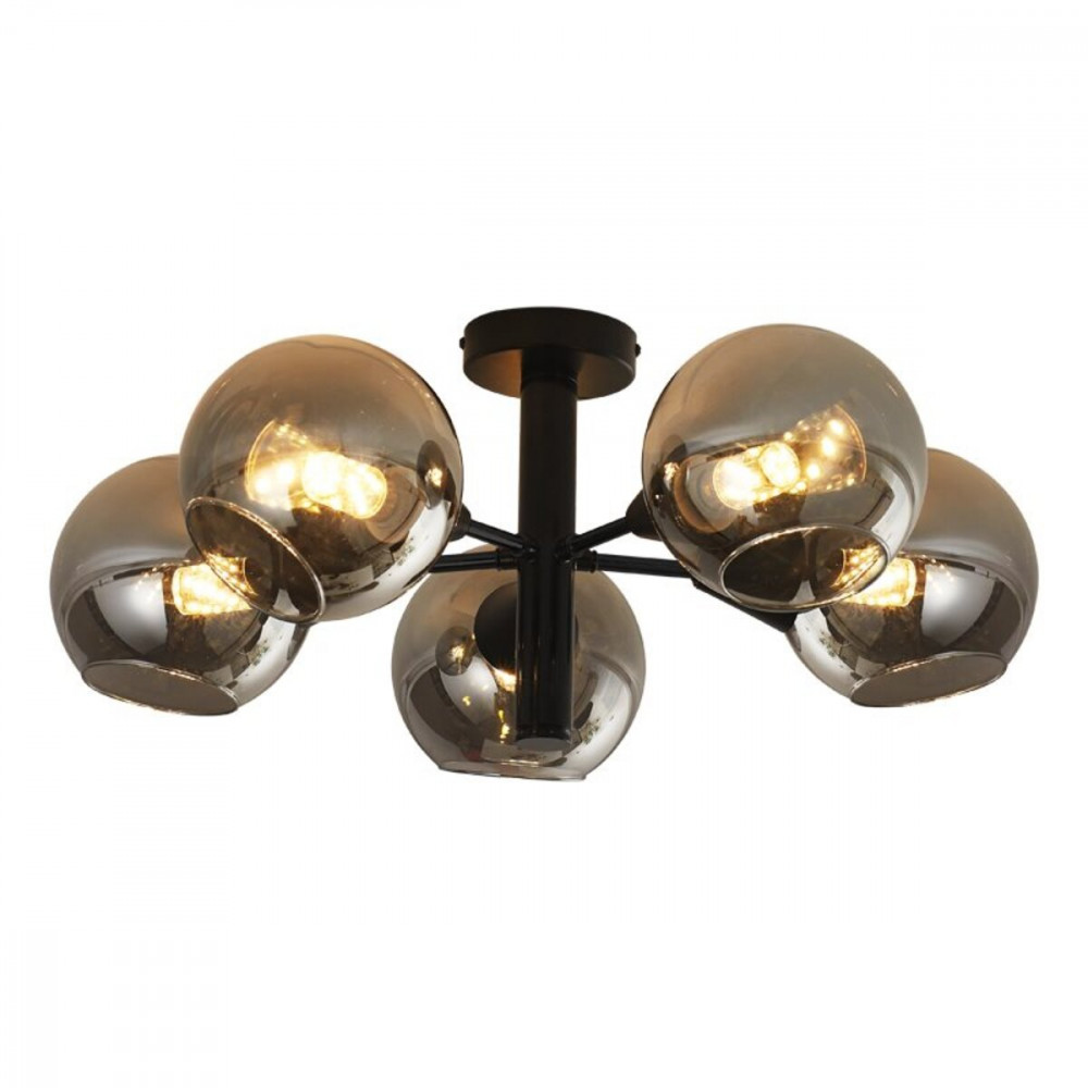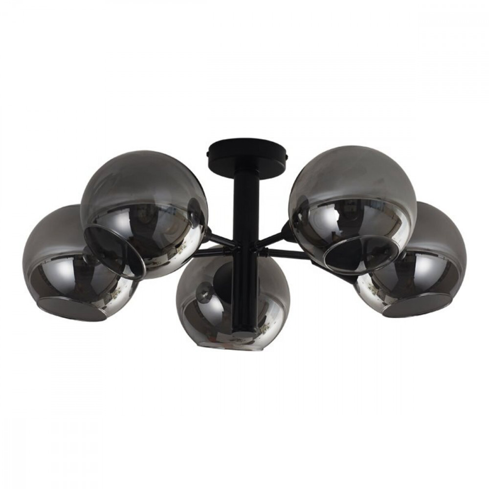 П' ять круглих плафонів зі скла у сірому відтінку розсіюють світло рівномірно, створюючи приємну та затишну атмосферу. З цоколем Е14, ця люстра підтримує використання лампочок до 60 Ватт, забезпечуючи достатнє освітлення для вашого приміщення.