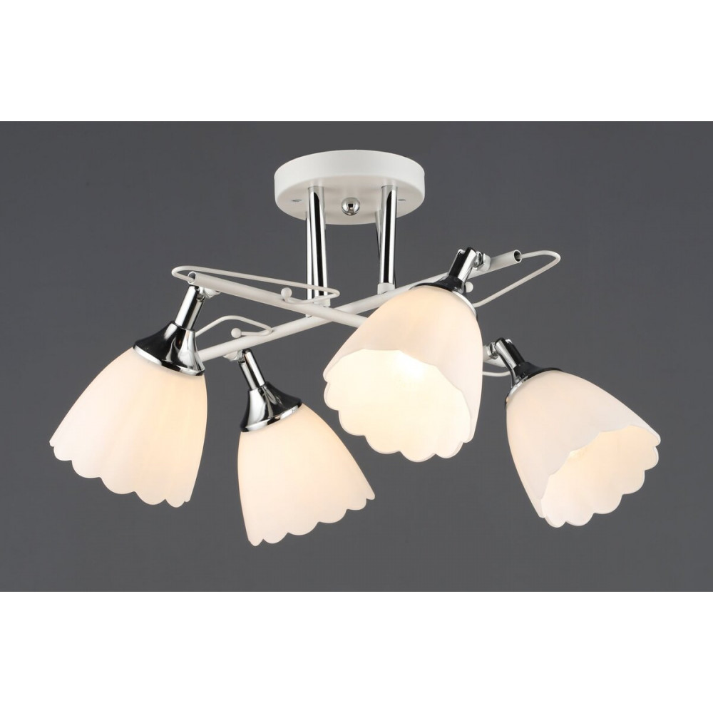 Хромовані елементи основи додають люстрі елегантності, а чотири плафони, розташовані по колу, забезпечують рівномірне та ефективне освітлення. Завдяки невеликій висоті модель ідеально підходить навіть для кімнат із низькими стелями.