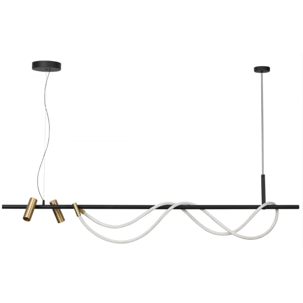 • Гнучкість у налаштуванні – два металеві плафони мають поворотний механізм для направлення світла, а один довгий текстильний плафон додає оригінальності.