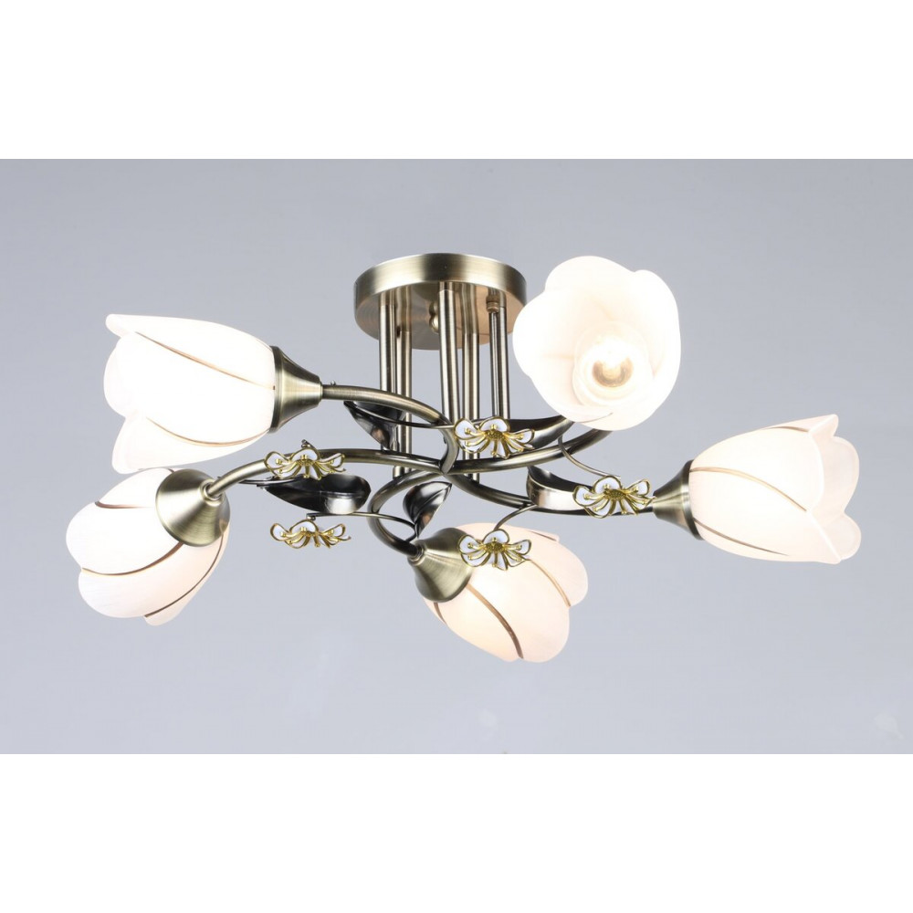 B N1508/5 AB — витончена люстра з бронзовим каркасом та скляними плафонами у формі квіток. Такий дизайн створює затишну атмосферу в будь-якому приміщенні, додаючи інтер’єру елегантності. Плафони у вигляді квіточок надають люстрі ніжного вигляду, а відсутність лампочок у комплекті дозволяє обрати світлову температуру за власним смаком.