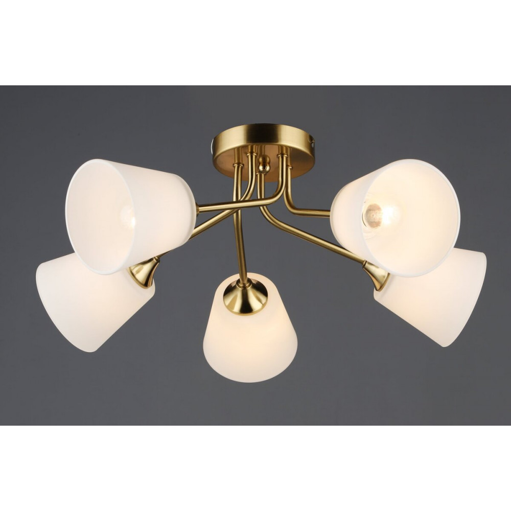 П’ятилампова люстра у мідному кольорі — поєднання класики та сучасного стилю. Завдяки скляним абажурам і теплому відтінку металу вона дарує м’яке, рівномірне світло і чудово підходить для зон загального освітлення.