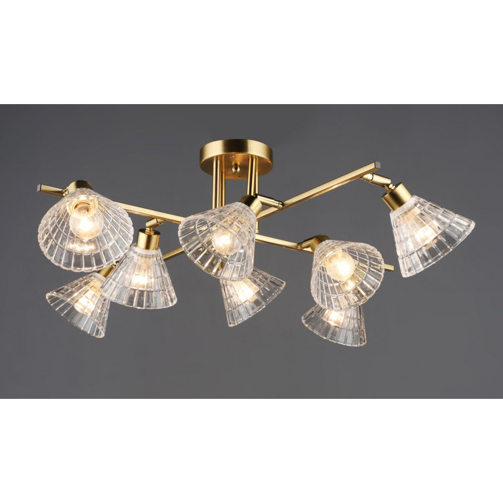 Люстра B N6653/8 — елегантна модель із вісьмома скляними плафонами у вишуканому мідному кольорі. Її візуальна легкість та класична форма гармонійно поєднуються з сучасними чи ретро-інтер’єрами. Завдяки патронам E14 люстра забезпечує яскраве та водночас м’яке освітлення.