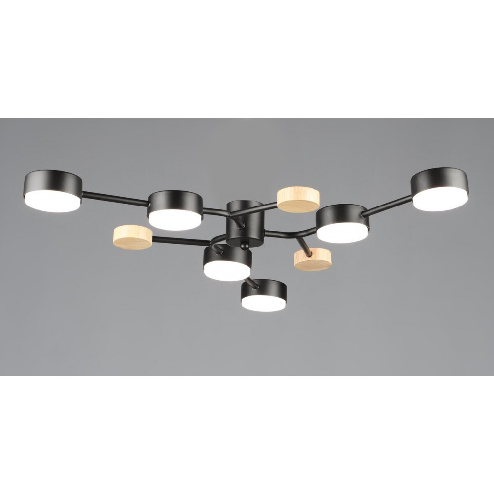 Люстра виконана у стильному контрасті чорного металу та декоративних елементів дерева. Конструкція з шести джерел світла забезпечує ефективне та рівномірне освітлення. Завдяки патронам типу GX53 ця модель ідеально підходить для використання сучасних та економічних LED-ламп.