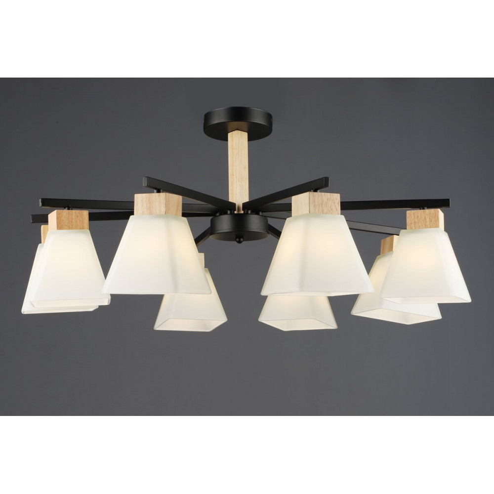 Вишуканий дизайн та преміальні матеріали: Люстра N6608/8 вражає своїм гармонійним поєднанням трендового чорного кольору та натуральних, теплих дерев'яних елементів. Цей контраст додає глибини та універсальності, дозволяючи люстрі ідеально вписатися у стилі лофт, модерн, скандинавський або мінімалістичний інтер'єр. Виготовлена з високоякісної сталі та міцного скла, вона гарантує виняткову довговічність та надійність.