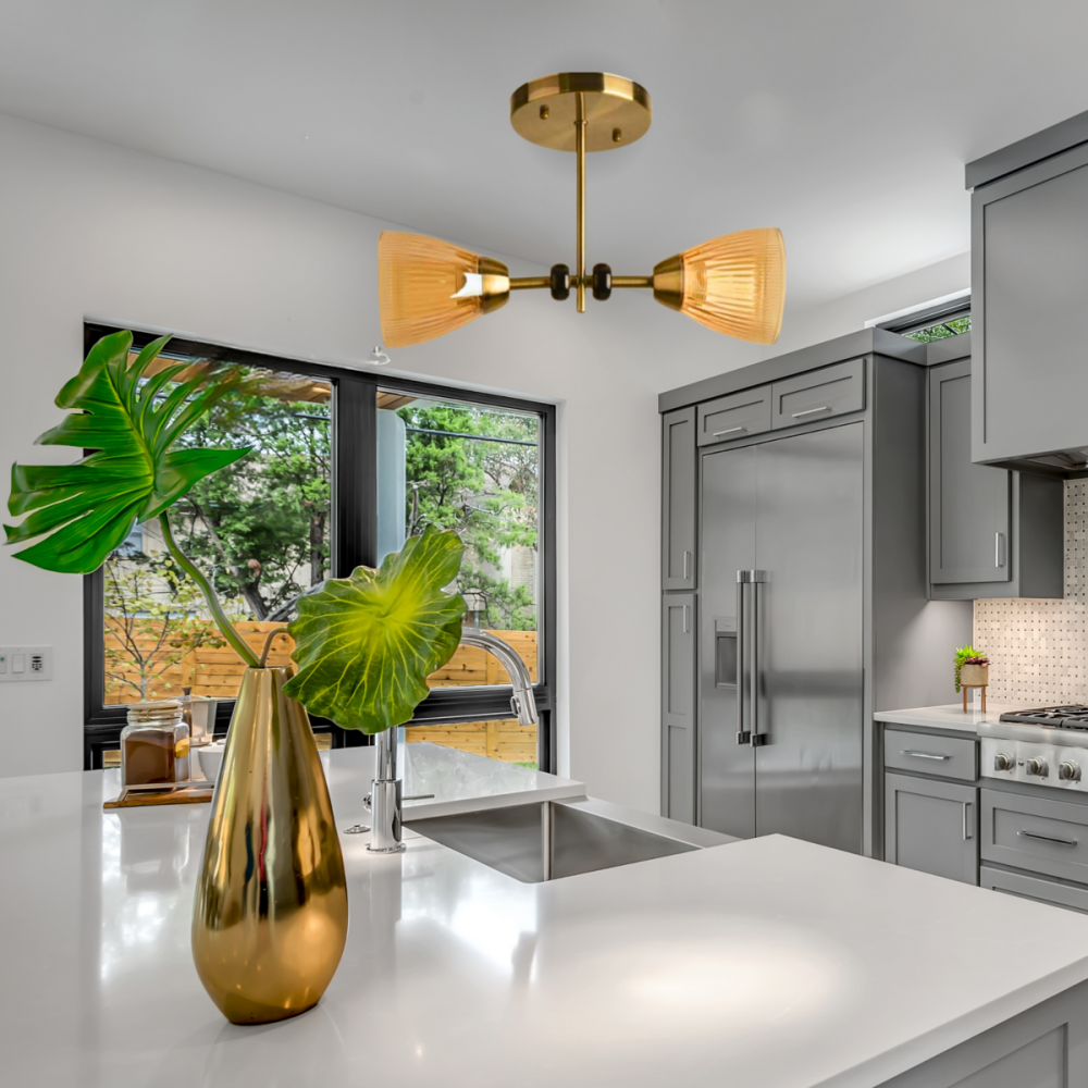 Плафони лампи мають конусну форму і виготовлені зі скла золотистого відтінку. Кожен плафон спрямований в різних напрямках, створюючи цікавий ефект освітлення та гри світла. Золотисте скло додає теплоти і шарму до внутрішнього простору.