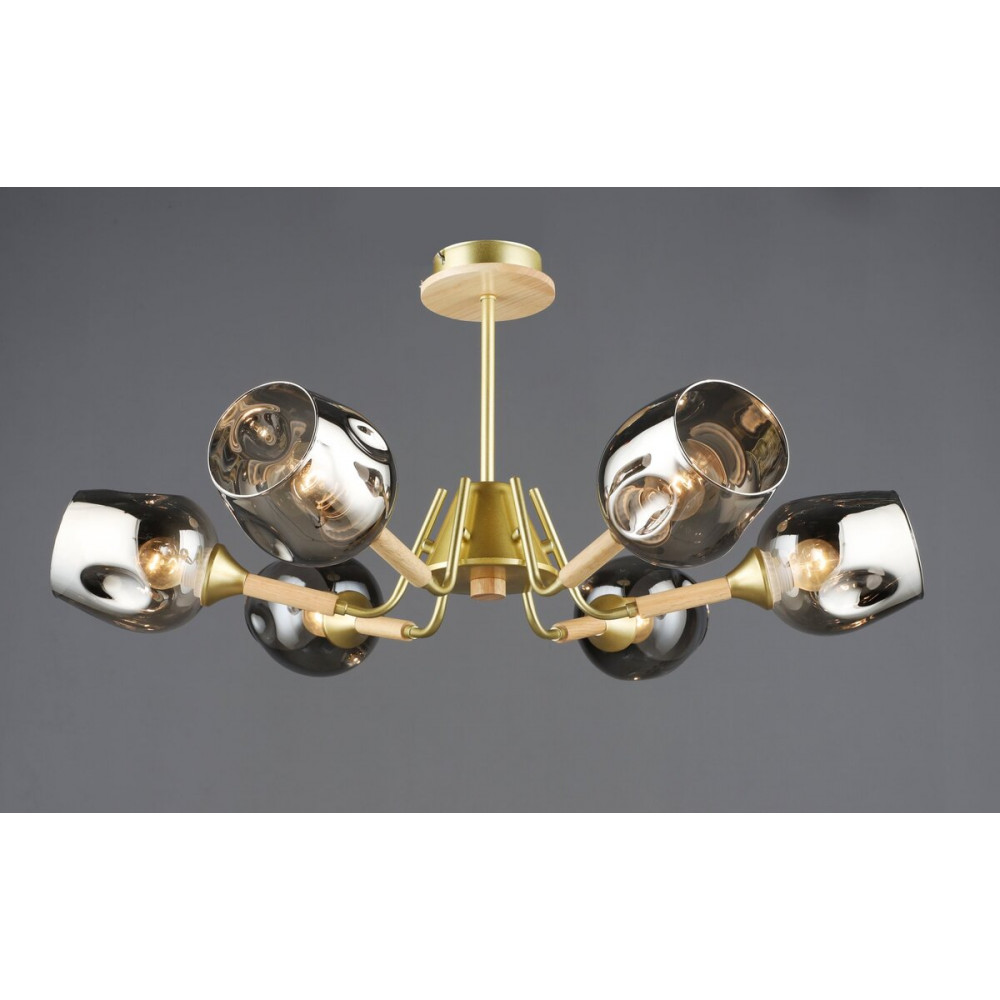 Підвісна люстра VALESO N6619/6 — це елегантне поєднання золотистої фурнітури, декоративних дерев’яних вставок та скляних плафонів, яке створює теплу, затишну атмосферу в інтер’єрі.