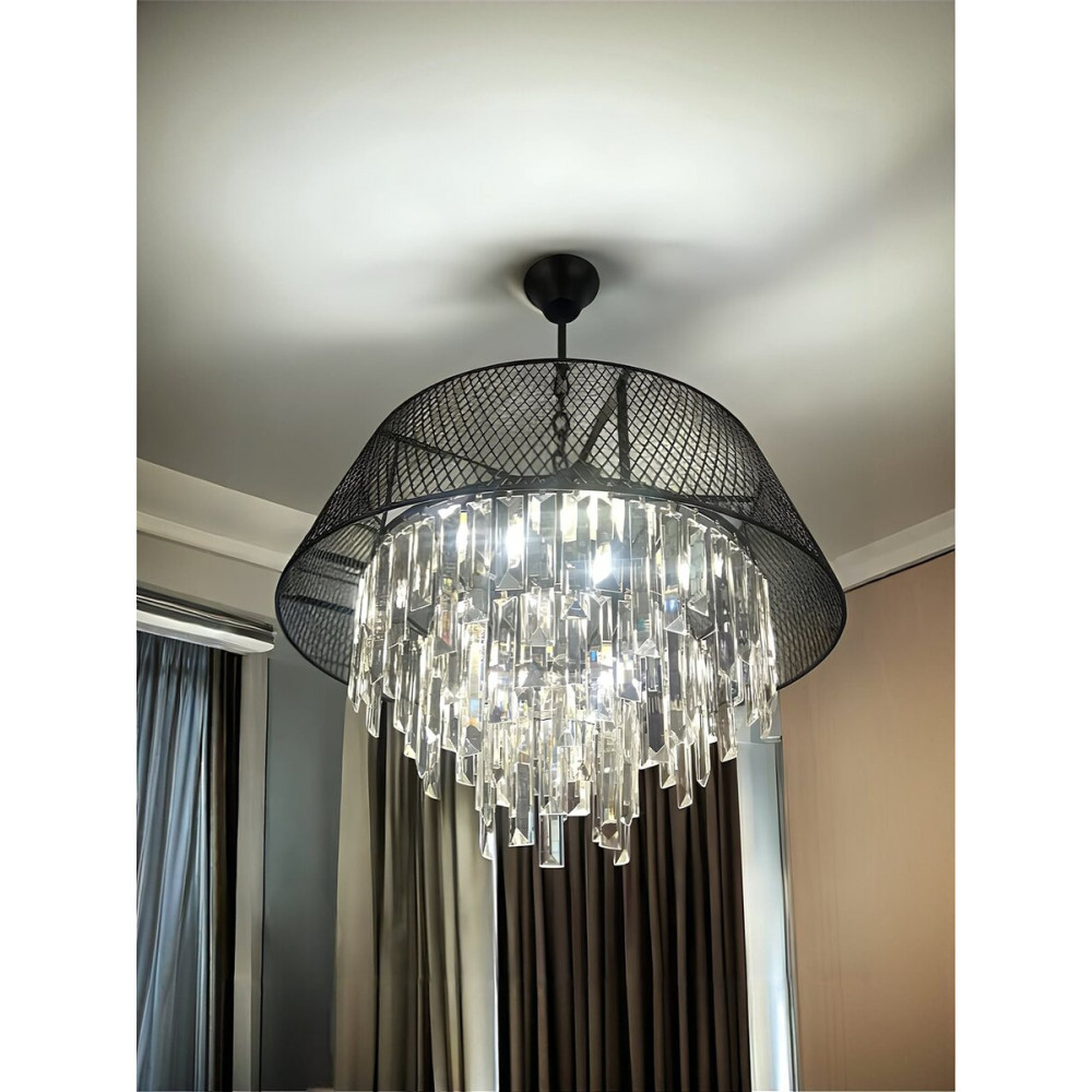 Завдяки благородному чорному кольору каркасу з металу та кришталевим підвіскам, вона гармонійно впишеться в інтер’єр вітальні, спальні, кабінету чи ресторану.