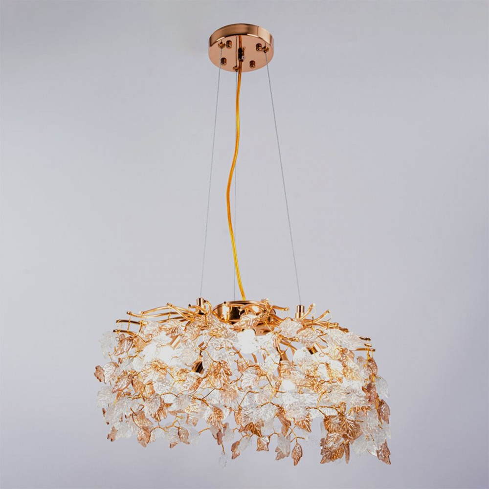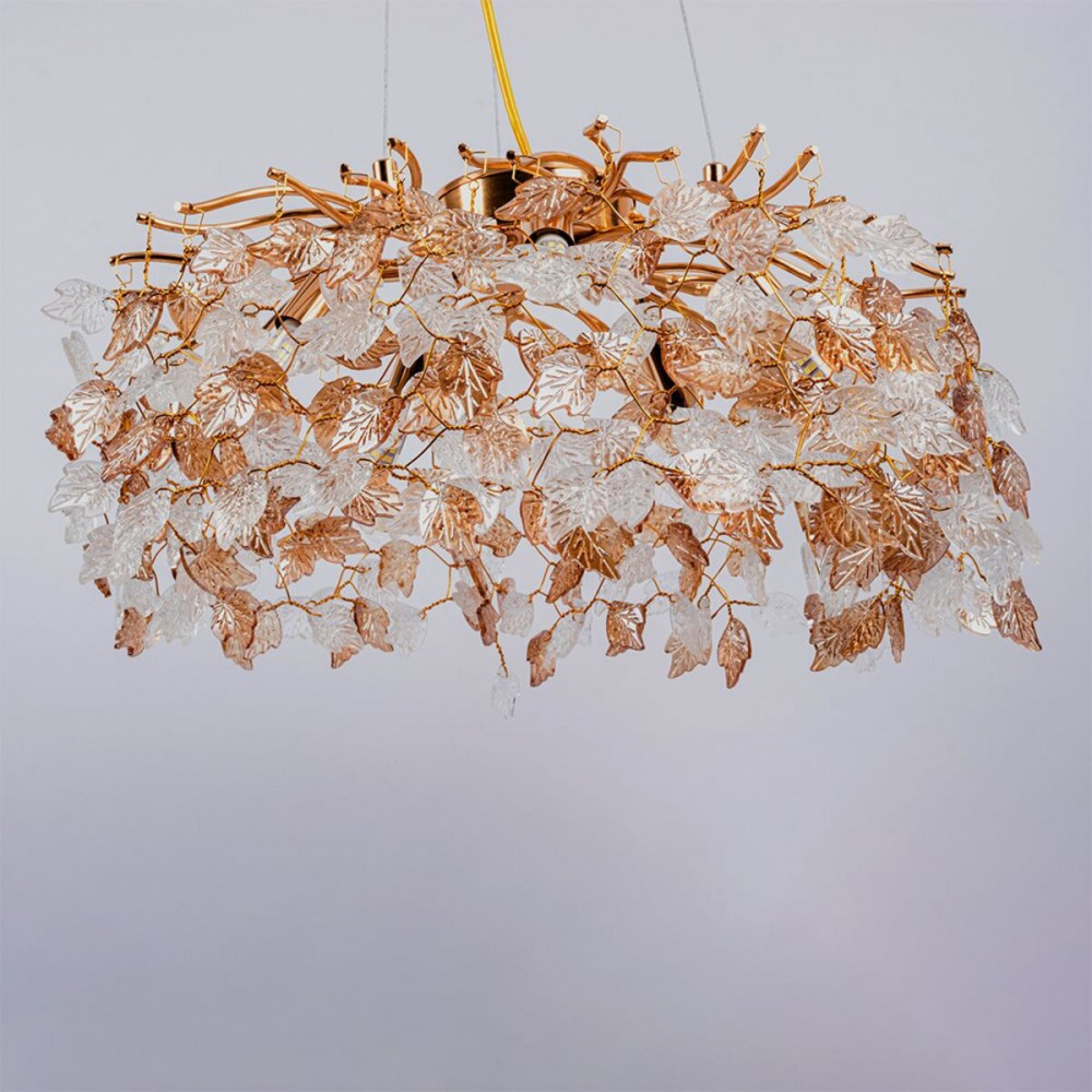 Елегантна підвісна люстра WM-7008 400-G9*5-38 GD поєднує прозорий кришталь із бурштиновими відтінками. Витончений дизайн створює ефектне поєднання кольорів та підкреслює сучасний стиль освітлення. Основа люстри виконана в золотому кольорі, що додає інтер'єру тепла та розкоші.