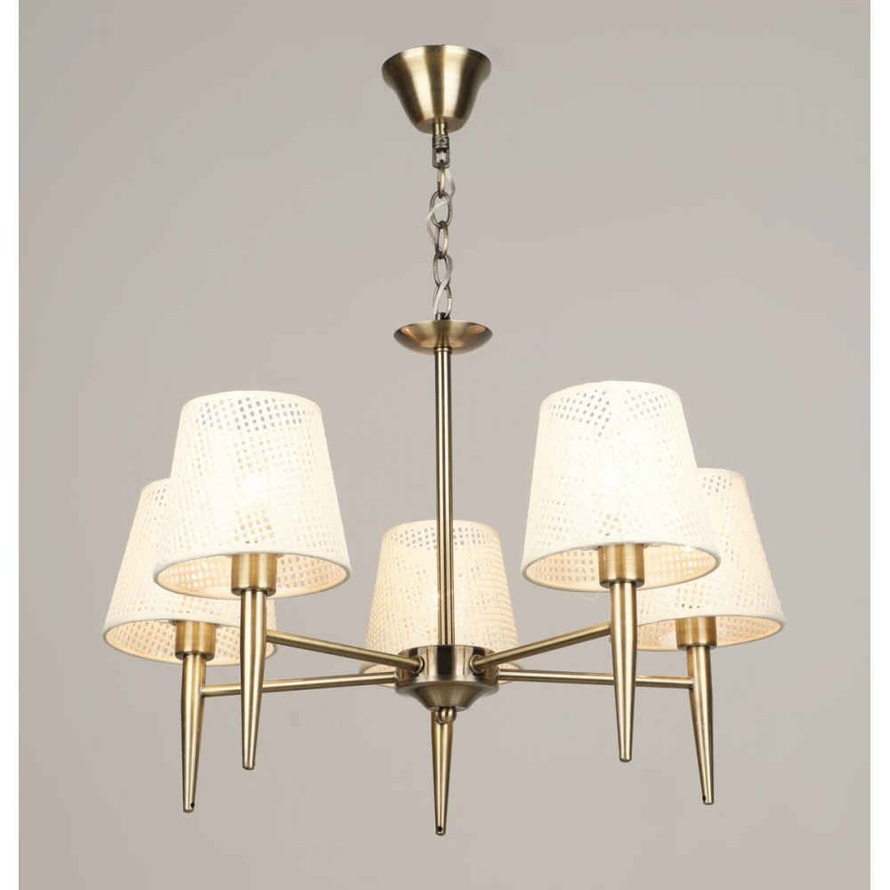 Основа люстри виконана з міцної сталі у благородному кольорі бронза, що надає їй вінтажного шарму. П'ять плафонів з тканини забезпечують м'яке, розсіяне світло, створюючи теплу та розслаблюючу атмосферу. Модель оснащена п'ятьма стандартними патронами E14, що дозволяє використовувати енергоефективні LED-лампи або лампи розжарювання на ваш вибір.