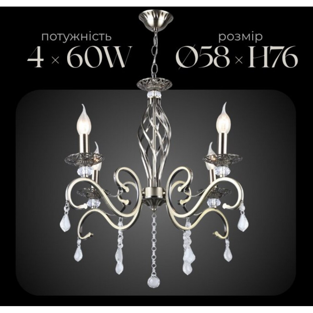 B N1208/4 — витончена класична люстра з бронзовим каркасом і декоративними елементами. Особливість дизайну — лампи вкручуються у тримачі, що стилізовані під свічки, створюючи ефект класичного підсвічника. Така люстра додає інтер’єру тепла, затишку та елегантності. Чудовий вибір для віталень, залів, спалень та просторих кімнат.