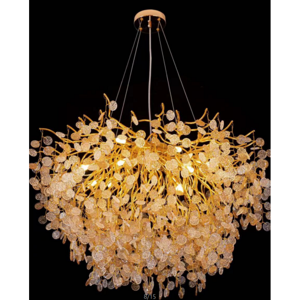 Розкішна підвісна люстра WM-7002 500-G9*6-52 GD поєднує прозорий кришталь із легкими бурштиновими відтінками, що створює тепле, затишне світло. Основа виконана у золотому кольорі, надаючи виробу елегантного та благородного вигляду. Така модель стане стильним акцентом у вітальні, залі або просторому холі.
