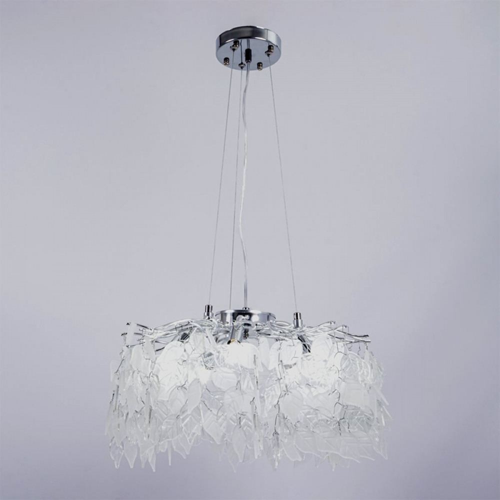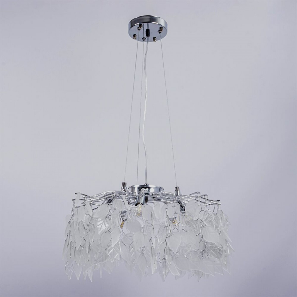 Ця модель із прозорого кришталю та білого матового скла на елегантному срібному каркасі створить неповторну атмосферу у вашому домі або офісі.