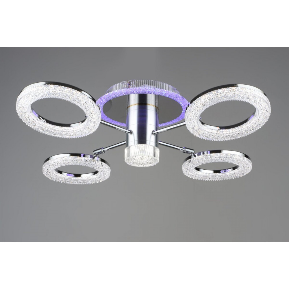Благородний металевий каркас у хромовому кольорі, разом з чотирма акриловими плафонами круглої форми, виражає не лише сучасний дизайн, але та елегантність. Вбудована підсвітка корпусу та зручний пульт в комплекті додають функціональність та комфорт в користуванні.