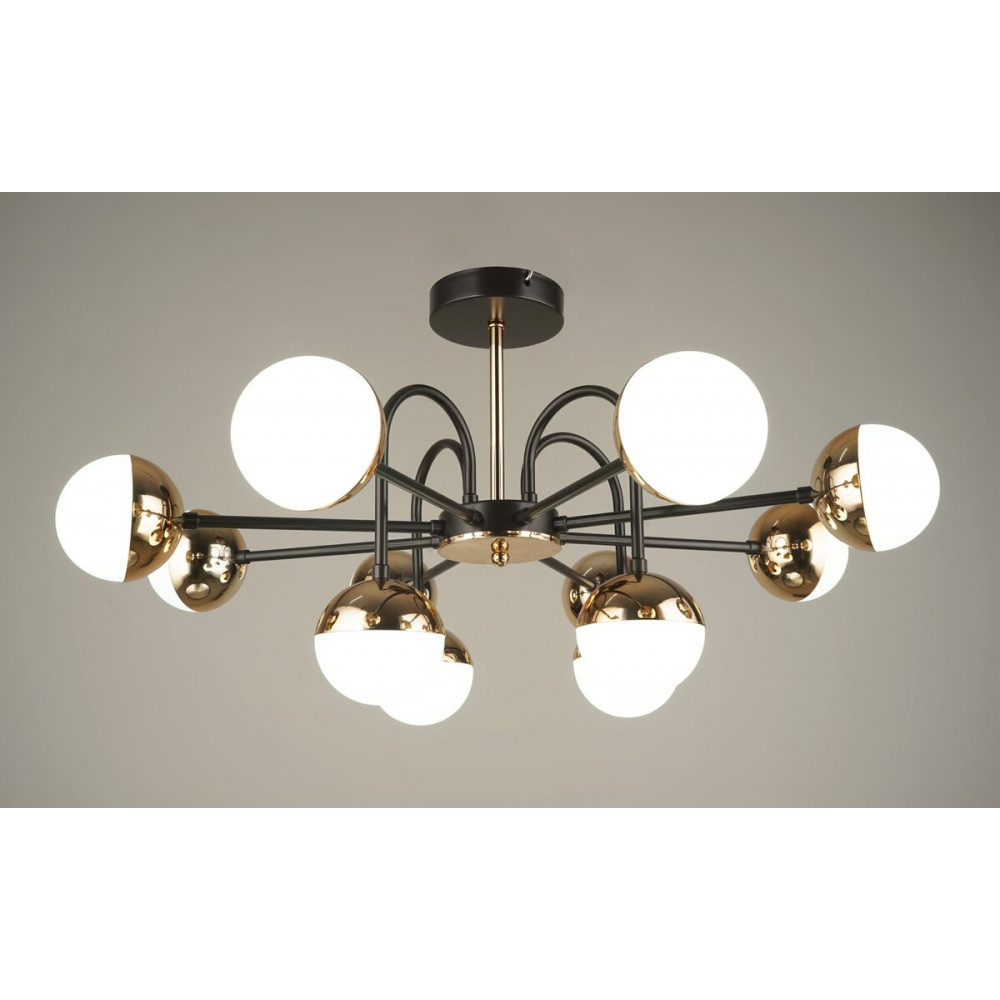 Каркас люстри виконаний з металу чорного та позолоченого кольору, що додає їй сучасного вигляду з елементами розкоші. 12 круглих акрилових плафонів забезпечують яскраве та м’яке світло, яке рівномірно розподіляється по всьому приміщенню.