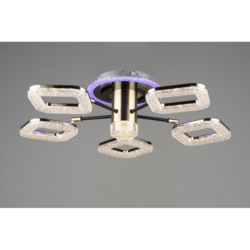 Благородний металевий каркас у золотому та чорному кольорах, разом із п'ятьма акриловими плафонами, виражає не лише сучасний дизайн, але та елегантність. Вбудована підсвітка корпусу та зручний пульт в комплекті додають функціональність та комфорт в користуванні.