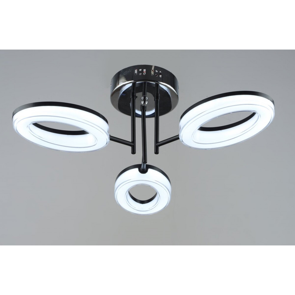 Елегантний каркас із металу чорного та хромового кольору надає люстрі сучасного вигляду, а три акрилові плафони створюють приємне та рівномірне освітлення. Розмір люстри – діаметр 610 мм, висота 175 мм – робить її ідеальною як для просторих, так і для компактних приміщень.