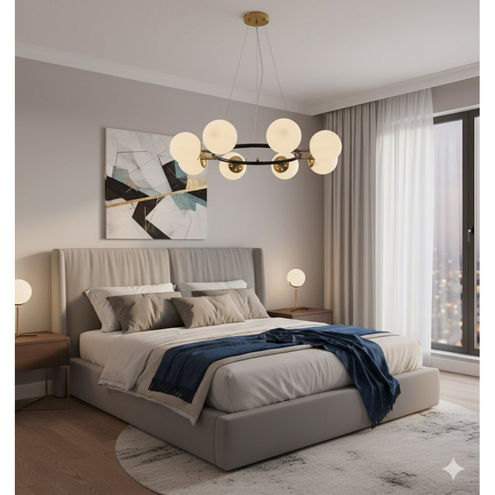 Вісім круглих плафонів: Білі скляні плафони м'яко розсіюють світло, створюючи комфортну та затишну атмосферу у вашому просторі.