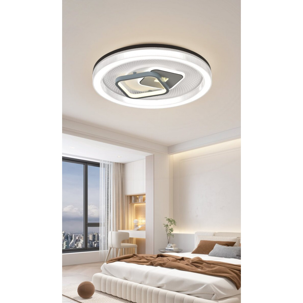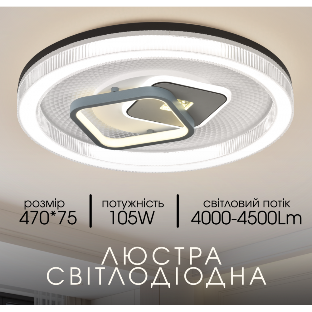 Модель оснащена вбудованими світлодіодами та має вражаючу загальну потужність 50W+55W, що дає потужний світловий потік у діапазоні 4000-4500 Lm. Ця особливість дозволяє ефективно освітлювати значну площу. Керування здійснюється традиційним способом, оскільки пульт дистанційного керування не передбачено, що робить використання люстри простим та зручним.