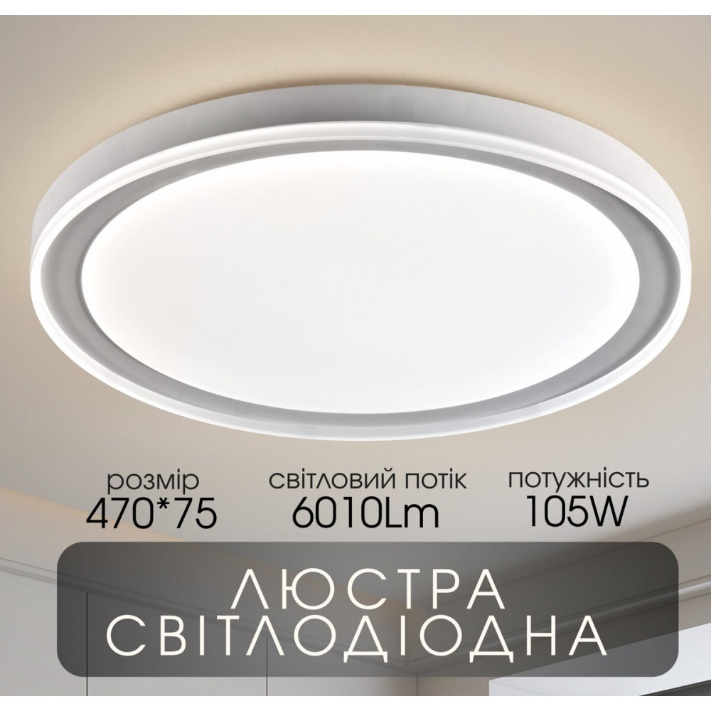Модель оснащена вбудованими світлодіодами та має вражаючу загальну потужність 70W+35W, що дає потужний світловий потік у 6010 Lm. Ця особливість дозволяє ефективно освітлювати значну площу. Керування здійснюється традиційним способом, оскільки пульт дистанційного керування не передбачено, що робить використання люстри простим та зручним.