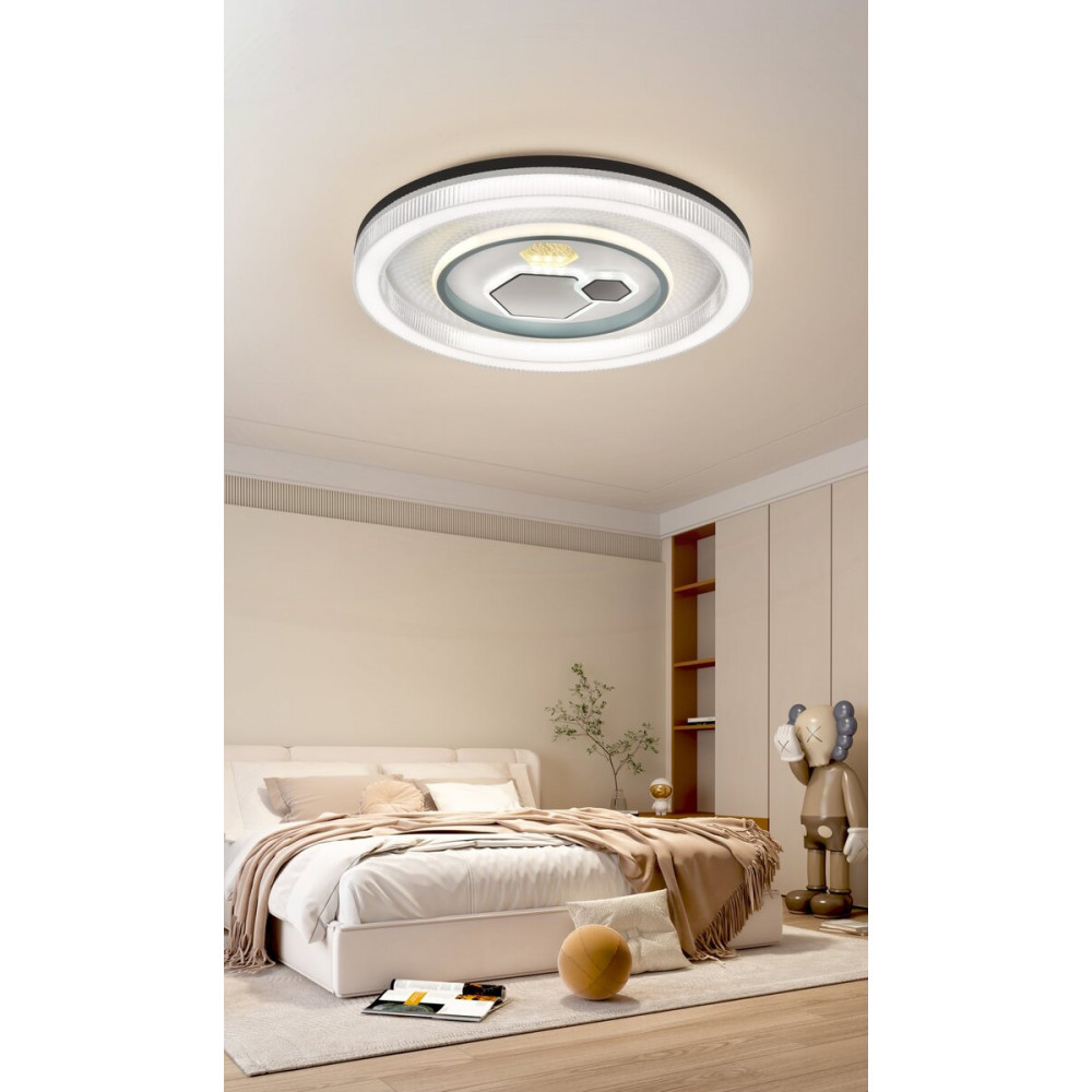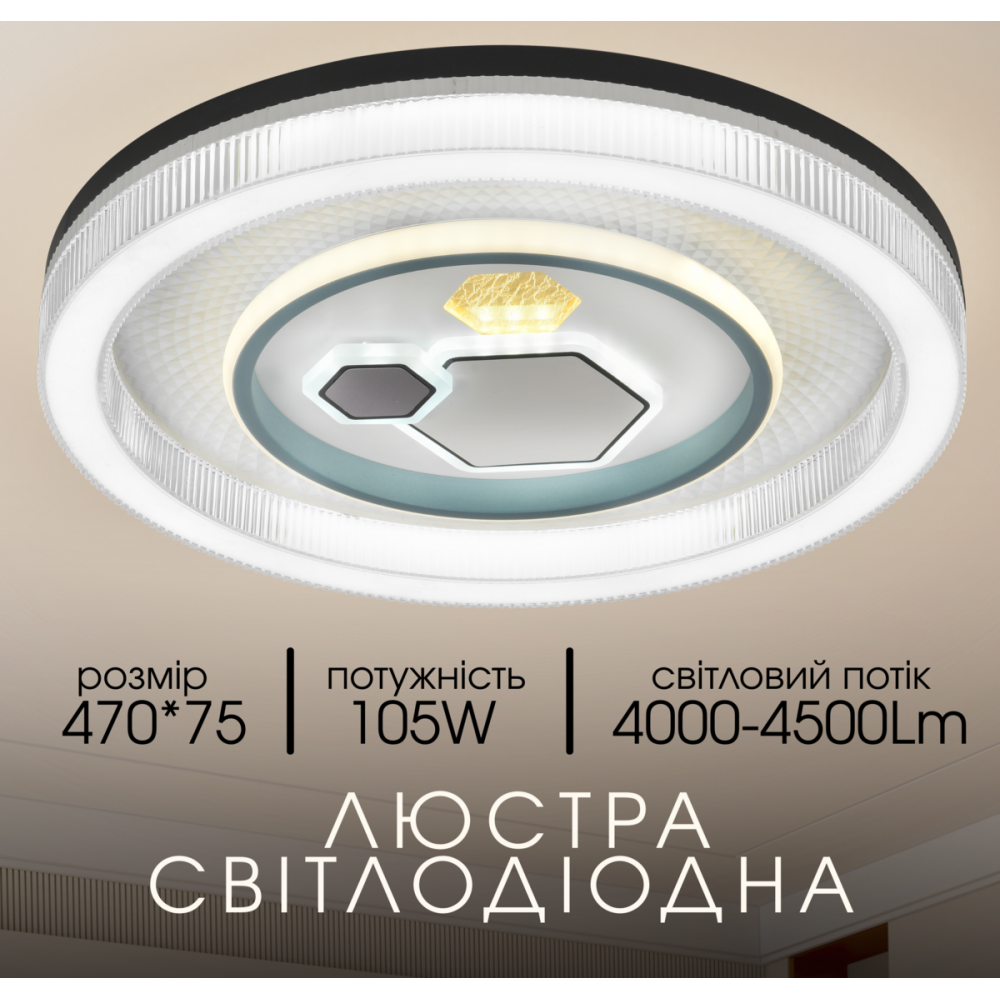 Модель оснащена вбудованими світлодіодами та має вражаючу загальну потужність 50W+55W, що дає потужний світловий потік у діапазоні 4000-4500 Lm. Ця особливість дозволяє ефективно освітлювати значну площу. Керування здійснюється традиційним способом, оскільки пульт дистанційного керування не передбачено, що робить використання люстри простим та зручним.