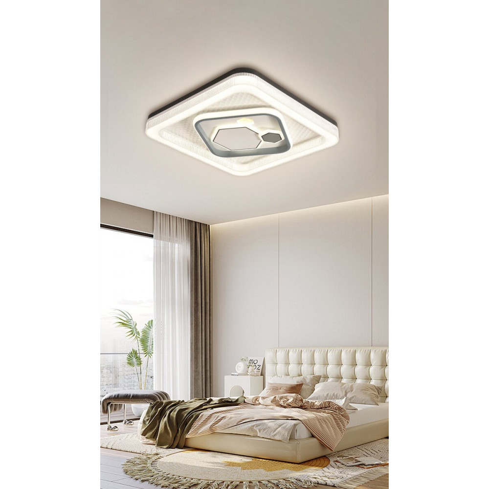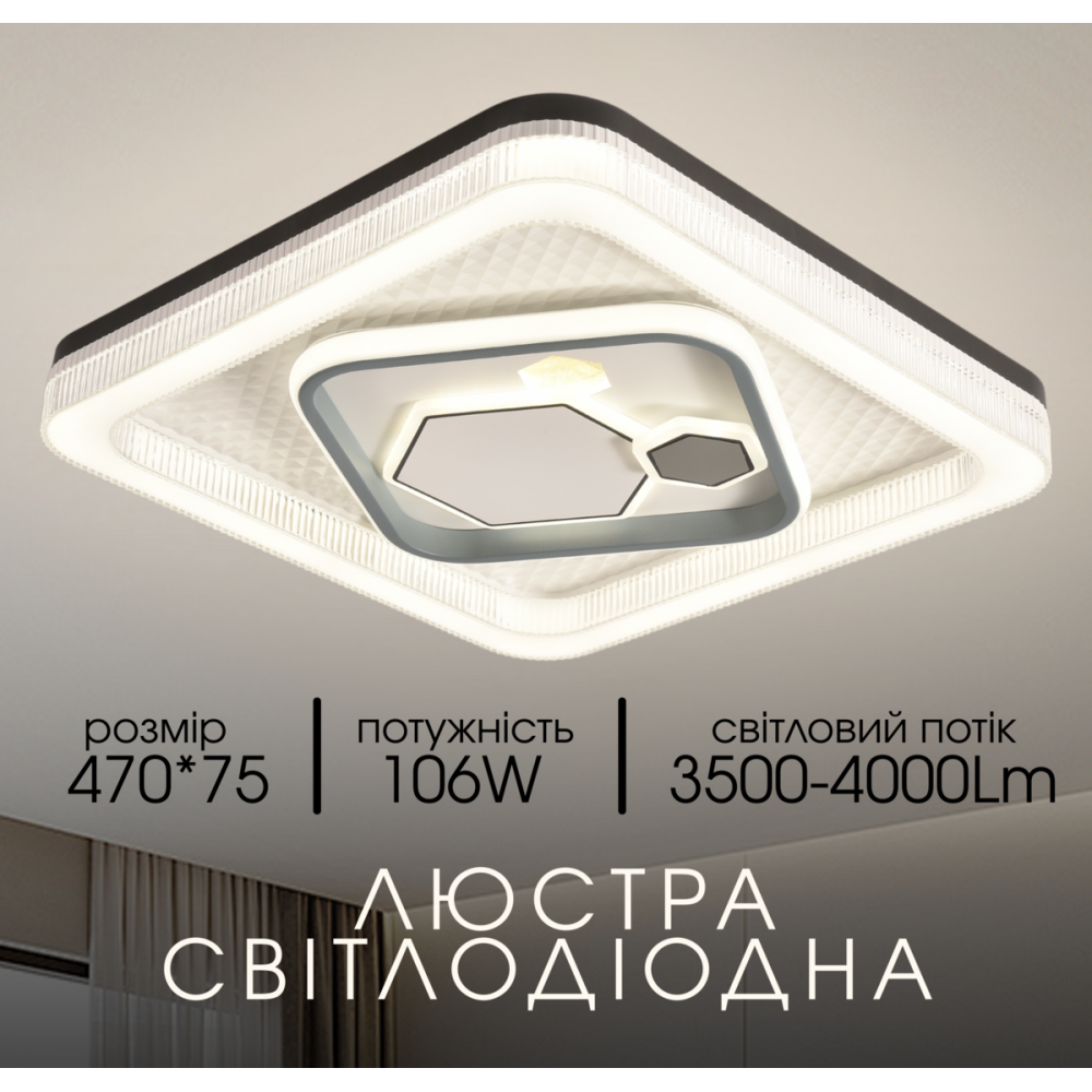Модель оснащена вбудованими світлодіодами та має вражаючу загальну потужність 50W+56W, що дає потужний світловий потік у діапазоні 3500-4000 Lm. Ця особливість дозволяє ефективно освітлювати значну площу. Керування здійснюється традиційним способом, оскільки пульт дистанційного керування не передбачено, що робить використання люстри простим та зручним.