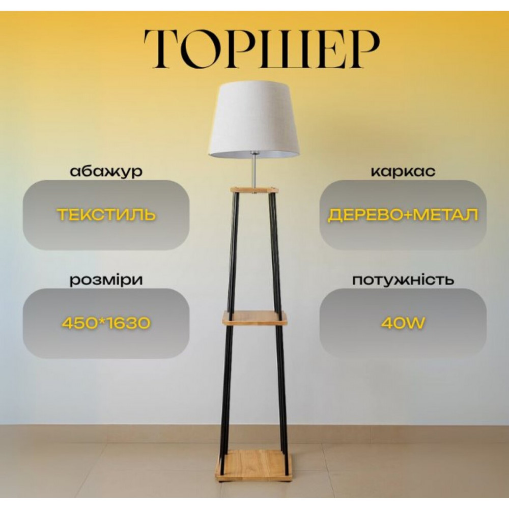 Завдяки розміру діаметра 450 мм та висоті 1630 мм, цей торшер з легкістю вписується в будь-який інтер'єр, надаючи йому елегантності та стилю. Каркас з металу та дерева додає йому додаткового шарму та надійності. Абажур з текстилю доповнює загальний вигляд, створюючи приємне та затишне освітлення в кімнаті.
